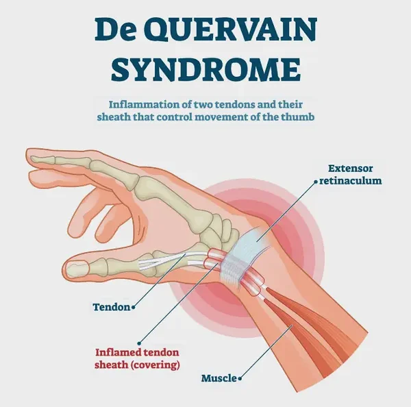 There is a simple way to test this: tuck your thumb into your fist and gently bend your wrist toward your pinky finger. If you feel a sharp shockwave of pain along the side of the wrist, you have experienced De Quervain’s Tenosynovitis.